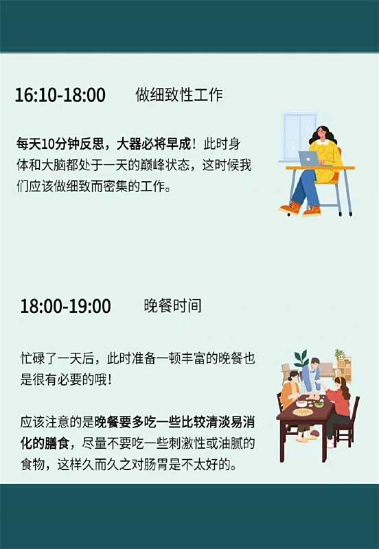 16:10-18:00做细致性工作每天10分钟反思,大器必将早成!此时身体和大脑都处于一天的巅峰状态,这时候我们应该做细致而密集的工作。