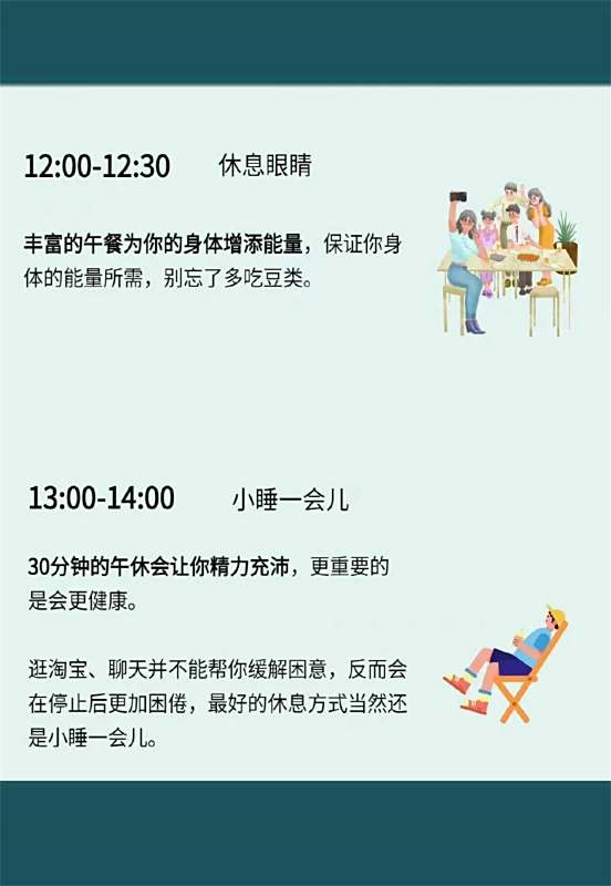 13:00-14:00小睡一会儿30分钟的午休会让你精力充沛,更重要的是会更健康。