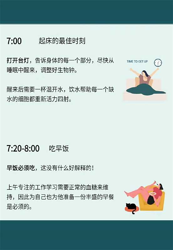7:20-8:00吃早饭早饭必须吃,这没有什么好解释的!上午专注的工作学习需要正常的血糖来维持,因此为自己也为他准备一份丰盛的早餐是必须的。