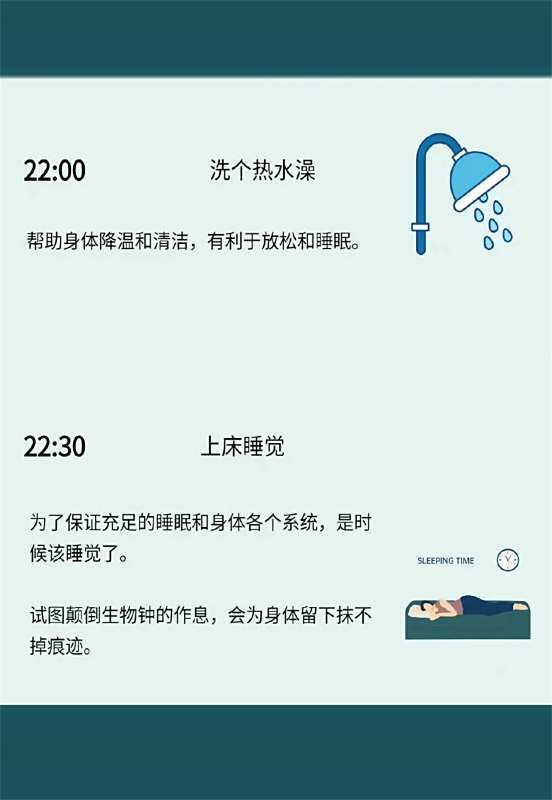 22:00洗个热水澡帮助身体降温和清洁,有利于放松和睡眠。