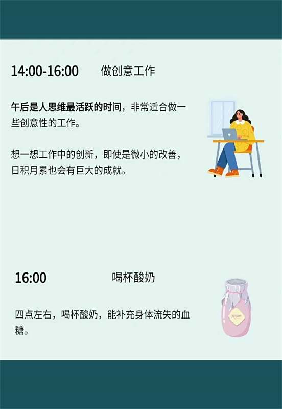 14:00-16:00做创意工作午后是人思维最活跃的时间,非常适合做一些创意性的工作。