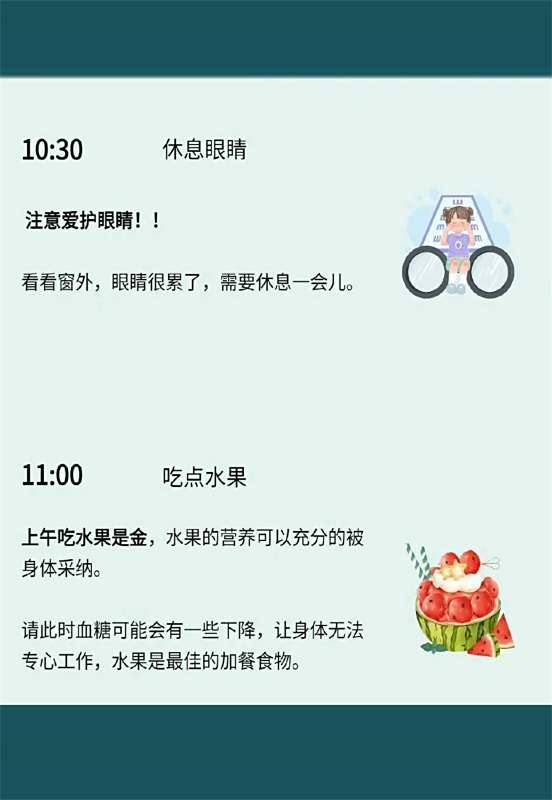 12:00-12:30休息眼睛丰富的午餐为你的身体增添能量,保证你身体的能量所需,别忘了多吃豆类。
