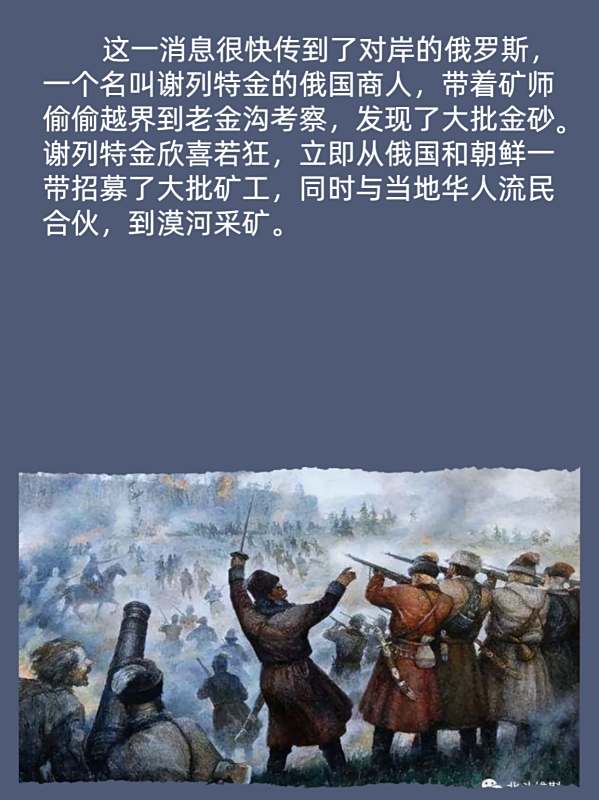 漠河位于中国最北端,与俄国隔江(黑龙江)而望。在清代开放东北封禁之前,漠河人烟稀少,是鄂伦春、索伦、奇勒尔民族的牧猎地区。1877年,一名鄂伦春族老猎人在漠河老金沟河谷葬马掘穴,无意中捞起一把河沙,发现河沙中金末子几乎占了一半。这一消息很快传到了对岸的俄罗斯,一个名叫谢列特金的俄国商人,带着矿师偷偷越界到老金沟考察,发现了大批金砂。谢列特金欣喜若狂,立即从俄国和朝鲜一带招募了大批矿工,同时与当地华人流民合伙,到漠河采矿。