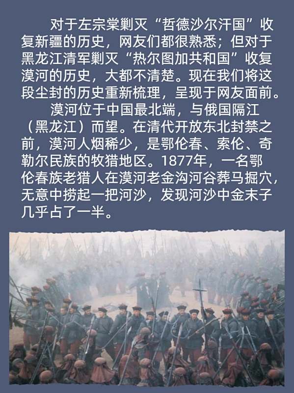 对于左宗棠剿灭“哲德沙尔汗国”收复新疆的历史,网友们都很熟悉;但对于黑龙江清军剿灭“热尔图加共和国”收复漠河的历史,大都不清楚。现在我们将这段尘封的历史重新梳理,呈现于网友面前。