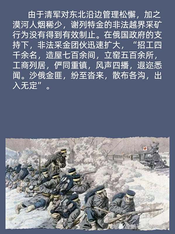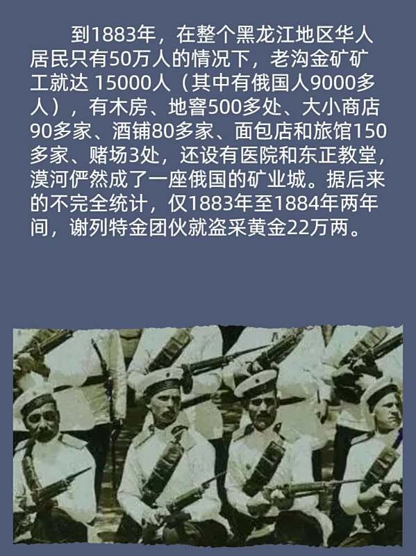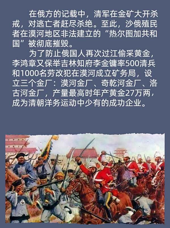 为了防止俄国人再次过江偷采黄金,李鸿章又保举吉林知府李金镛率500清兵和1000名劳改犯在漠河成立矿务局,设立三个金厂:漠河金厂、奇乾河金厂、洛古河金厂,产量最高时年产黄金27万两,成为清朝洋务运动中少有的成功企业。