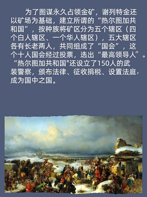 为了图谋永久占领金矿,谢列特金还以矿场为基础,建立所谓的“热尔图加共和国”,按种族将矿区分为五个辖区(四个白人辖区、一个华人辖区),五大辖区各有长老两人,共同组成了“国会”,这个十人国会经过投票,选出“最高领导人”。“热尔图加共和国"还设立了150人的武蔽此装警察,颁布法律、征收捐税、设置法庭,成为国中之国。