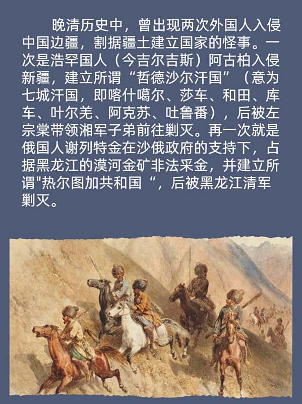 晚清历史中,曾出现两次外国人入侵中国边疆,割据疆土建立国家的怪事。一次是浩罕国人(今吉尔吉斯)阿古柏入侵新疆,建立所谓“哲德沙尔汗国”(意为七城汗国,即喀什噶尔、莎车、和田、库车、叶尔羌、阿克苏、吐鲁番),后被左宗棠带领湘军子弟前往剿灭。再一次就是俄国人谢列特金在沙俄政府的支持下,占据黑龙江的漠河金矿非法采金,并建立所谓"热尔图加共和国“,后被黑龙江清军剿灭。