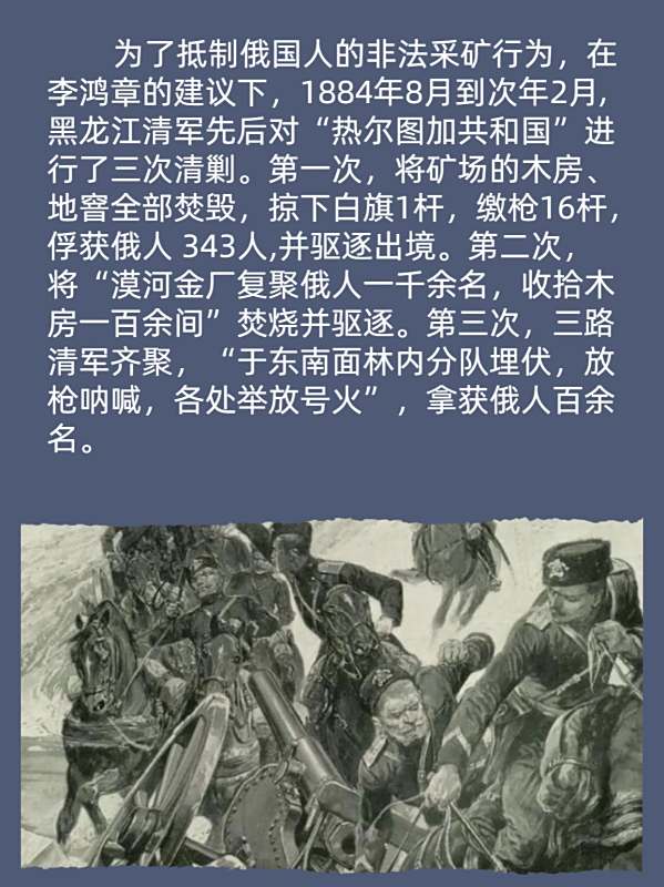 为了抵制俄国人的非法采矿行为,在李鸿章的建议下,1884年8月到次年2月,黑龙江清军先后对“热尔图加共和国”进行了三次清剿。第一次,将矿场的木房、地窨全部焚毁,掠下白旗1杆,缴枪16杆,俘获俄人 343人,并驱逐出境。第二次,将“漠河金厂复聚俄族并人一千余名,收拾木房一百余间”焚烧并驱逐。第三次,三路清军齐聚,“于东南面林内分队埋伏,放枪呐喊,各处举放号火”,拿获俄人百余名。在俄方的记载中,清军在金矿大开杀戒,对逃亡者赶尽杀绝。至此,沙俄殖民者在漠河地区非法建立的“热尔图加共和国”被彻底摧毁。