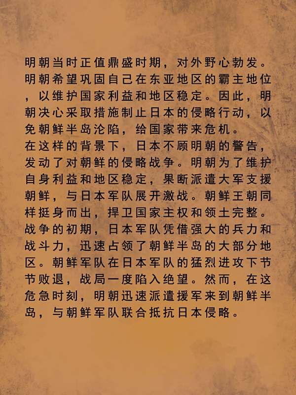 明朝当时正值鼎盛时期,对外野心勃发。明朝希望巩固自己在东亚地区的霸主地位,以维护国家利益和地区稳定。因此,明朝决心采取措施制止日本的侵略行动,以免朝鲜半岛沦陷,给国家带来危机。