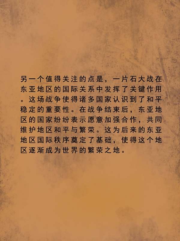 另一个值得关注的点是,一片石大战在东亚地区的国际关系中发挥了关键作用。这场战争使得诸多国家认识到了和平稳定的重要性。在战争结束后,东亚地区的国家纷纷表示愿意加强合作,共同维护地区和平与繁荣。这为后来的东亚地区国际秩序奠定了基础,使得这个地区逐渐成为世界的繁荣之地。