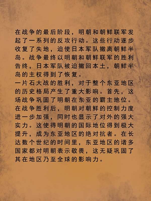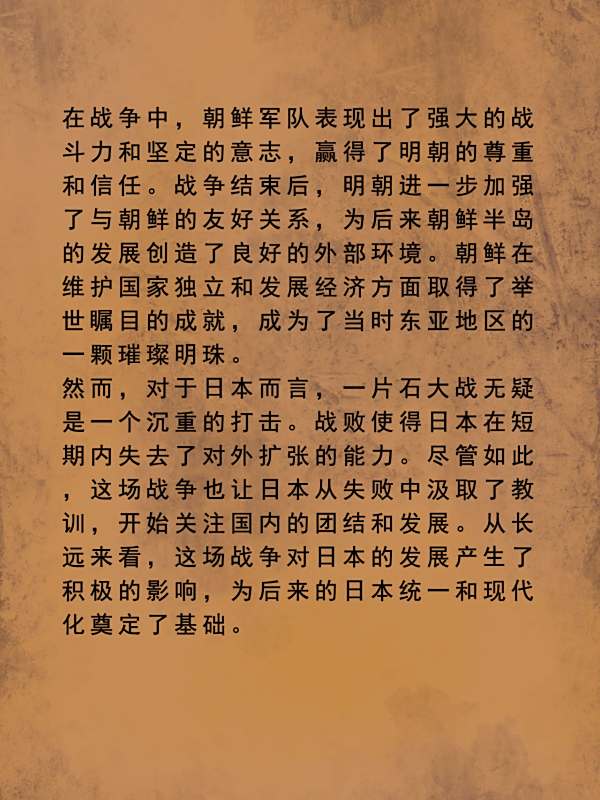 在战争中,朝鲜军队表现出了强大的战斗力和坚定的意志,赢得了明朝的尊重和信任。战争结束后,明朝进一步加强了与朝鲜的友好关系,为后来朝鲜半岛的发展创造了良好的外部环境。朝鲜在维护国家独立和发展经济方面取得了举世瞩目的成就,成为了当时东亚地区的一颗璀璨明珠。