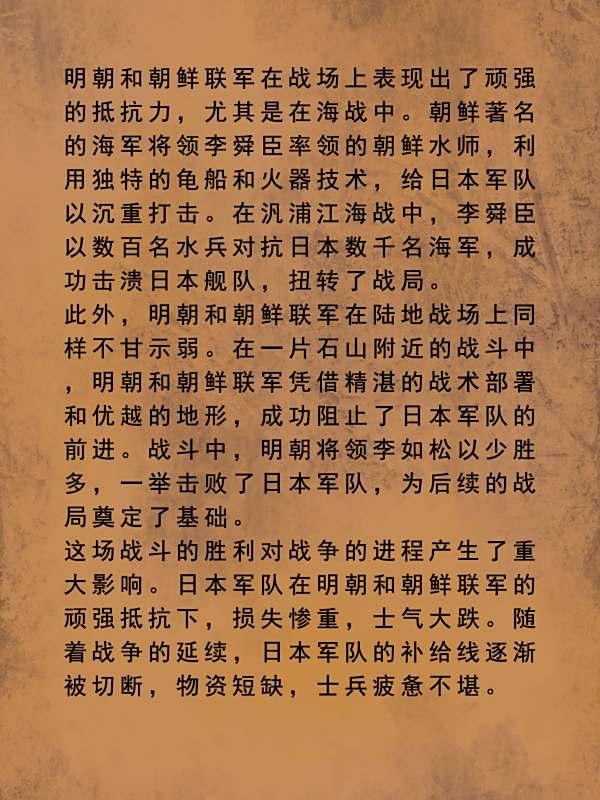 明朝和朝鲜联军在战场上表现出了顽强的抵抗力,尤其是在海战中。朝鲜著名的海军将领李舜臣率领的朝鲜水师,利用独特的龟船和火器技术,给日本军队以沉重打击。在泛浦江海战中,李舜臣以数百名水兵对抗日本数千名海军,成功击溃日本舰队,扭转了战局。