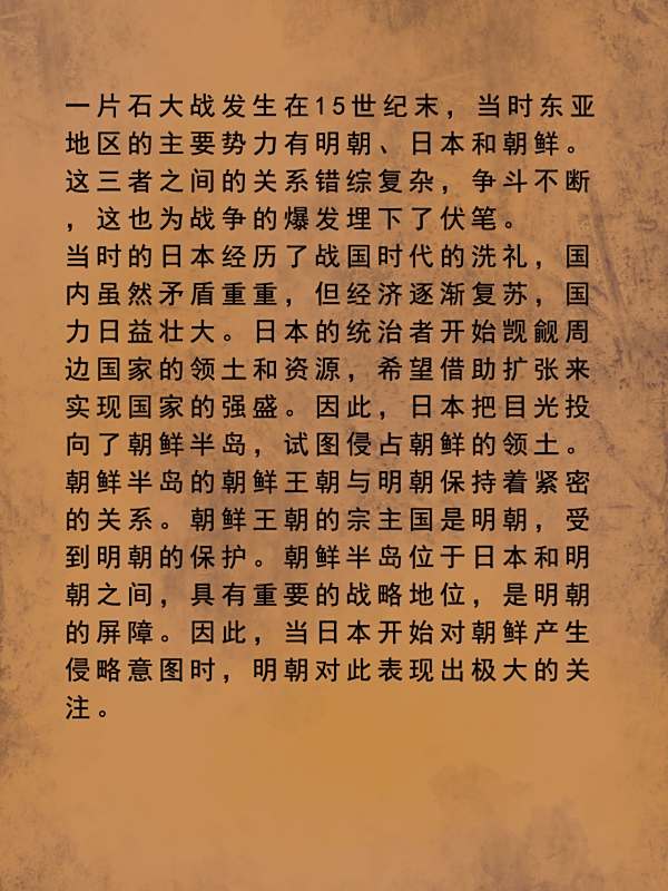 当时的日本经历了战国时代的洗礼,国内虽然矛盾重重,但经济逐渐复苏,国力日益壮大。日本的统治者开始觊觎周边国家的领土和资源,希望借助扩张来实现国家的强盛。因此,日本把目光投向了朝鲜半岛,试图侵占朝鲜的领土。