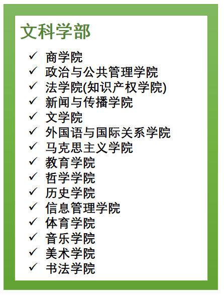 在郑大的本科生专业中,文科学部是由15个学院组成的,主要包括商学院,政治与公共管理学院,法学院(知识产权学院),新闻与传播学院,文学院,外国语与国际关系学院,马克思主义学院,教育学院,哲学学院,历史学院,信息管理学院,体育学院,音乐学院,美术学院,书法学院15个学院。