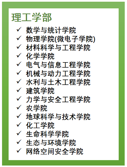 在郑大的本科生专业中,理工学部是由16个学院组成的,主要包括数学与统计学院,物理学院(微电子学院),材料科学与工程学院,化学学院,电气与信息工程学院,机械与动力工程学院,水利与土木工程学院,建筑学院,力学与安全工程学院,农学院,地球科学与技术学院,化工学院,生命科学学院,生态与环境学院,网络空间安全学院,计算机学院等16个学院。