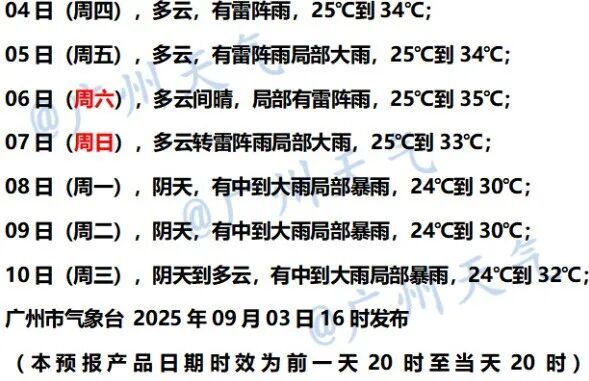广东省气象台预计,9月4日—6日广东中北部市县有35~37℃的高温天气,午后有分散(雷)阵雨局部大雨或暴雨,雷雨时局部伴有8~10级短时大风。