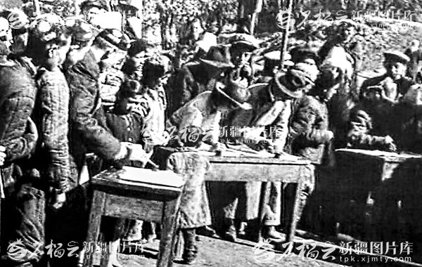 1938年,伊宁民众前往献金台,争相为抗战募捐。新疆图片库提供