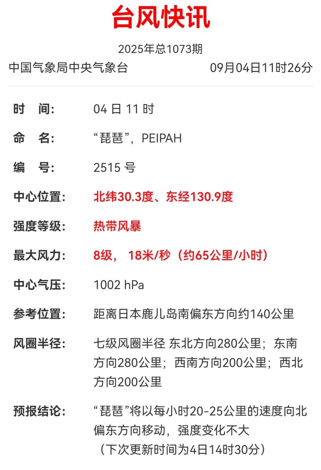 9月4日上午8点钟其中心位于日本鹿儿岛偏南方向约205公里的洋面上,就是北纬29.7度、东经130.7度。中心附近最大风力有8级(18米/秒),中心最低气压为1002百帕,七级风圈半径200~280公里。