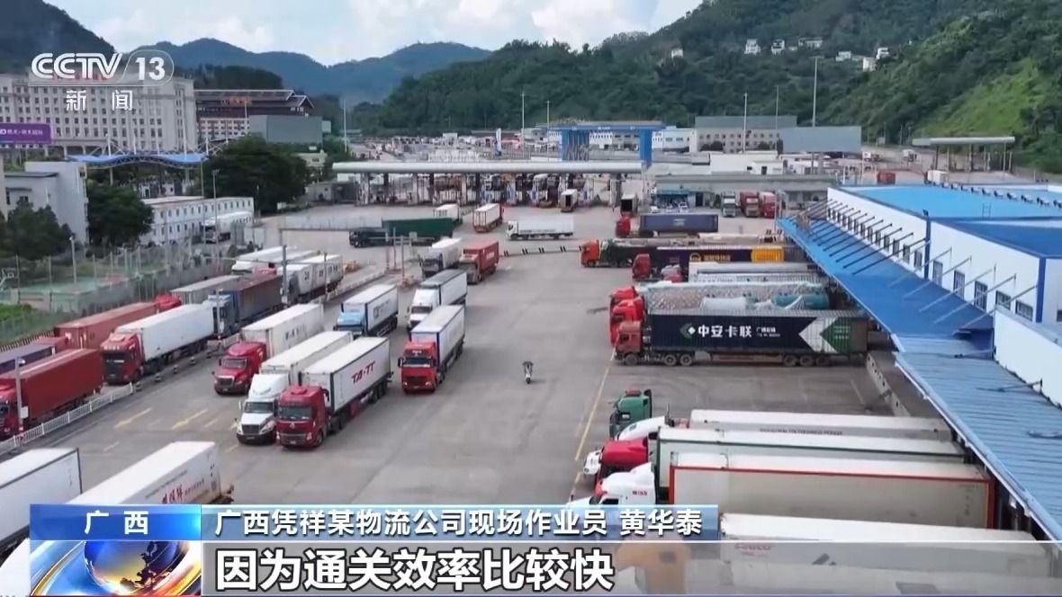 广西凭祥某物流公司现场作业员 黄华泰:我们公司主要从事菠萝蜜、芒果等东盟水果的进口,因为通关效率比较快,不少客户都愿意从这里进口。今年前8月我们在这里顺利通关了近3000柜的货物,这些东盟国家水果主要销售到广东、浙江等地。