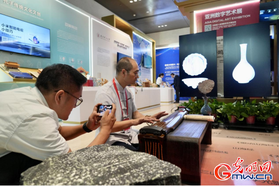 数字技术不是要取代传统非遗,而是要为非遗寻找新的传播载体与生存空间。展会现场,悠扬的古琴声不时引人驻足,这一声音来自唐影在线公司的展位。该公司带来的“亚洲数字艺术展—非遗互动展项·钧彩叠鸣”项目,以国家级非遗手工艺钧瓷“入窑一色,出窑万彩”窑变反应为切⼊点,结合新媒介互动装置对钧瓷进行“再表达”。