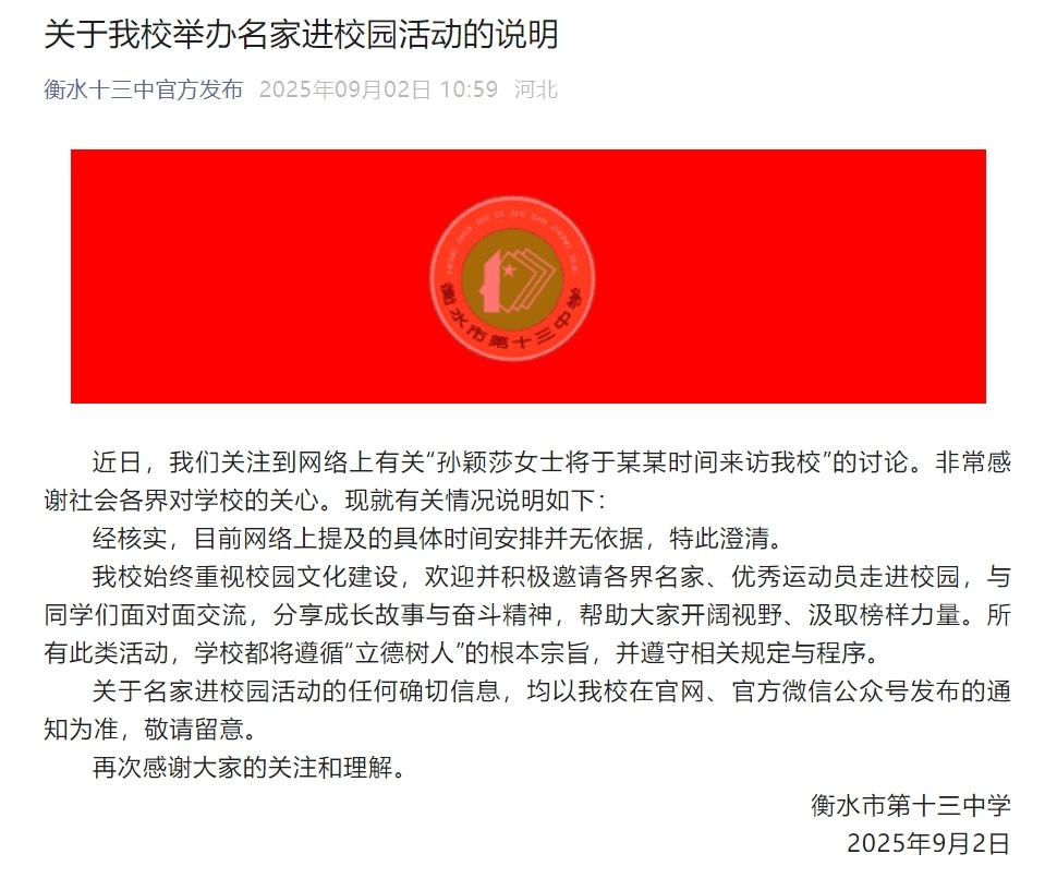 近日,我们关注到网络上有关“孙颖莎女士将于某某时间来访我校”的讨论。非常感谢社会各界对学校的关心。现就有关情况说明如下: