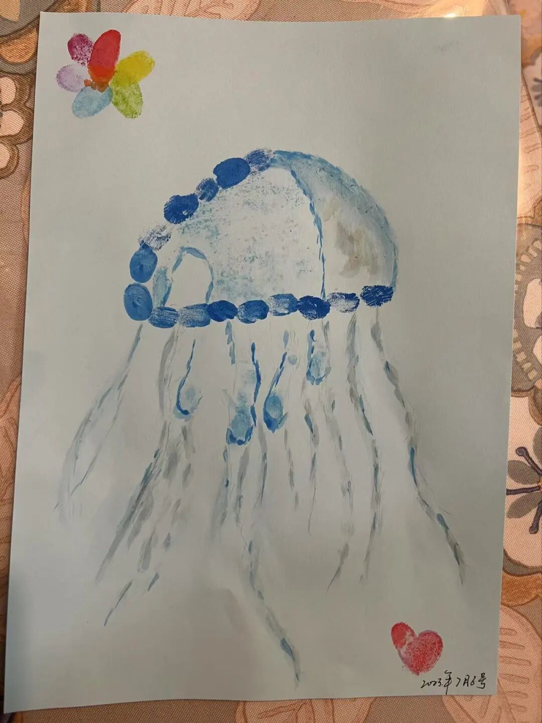 安安一家人创作的水母画,左上角为众人印成的太阳花。图/受访者提供
