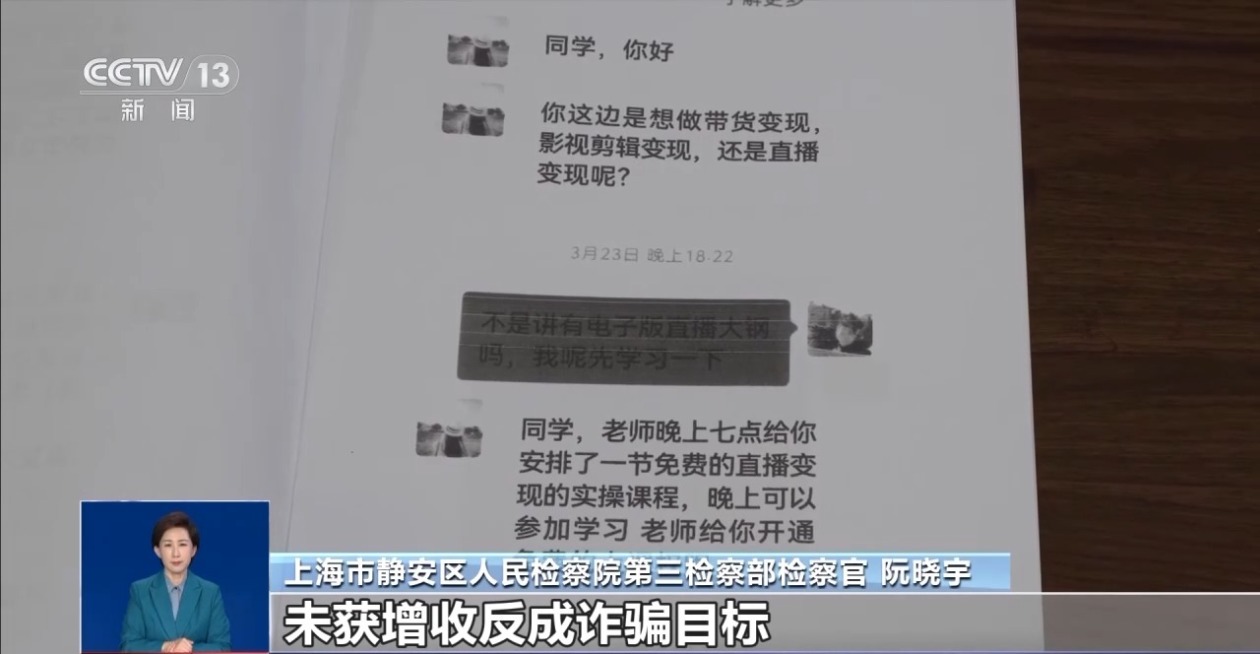 上海市静安区人民检察院第三检察部检察官 阮晓宇:被害人会被一些主播所推销的课程吸引,对方会自称是短视频平台的官方客服人员,告诉被害人平台正在开展创业者扶持计划。学习平台官方课程后,可在短视频平台发布视频,开展直播带货,轻松就能赚到不菲的收入。被害人根据指引会进入一个直播间,并支付人民币2900余元的课程费。在经过几天的学习之后,发现自己根据课程指导发布的视频根本没有浏览量,更不用说变现赚钱。当被害人找客服申请退款时,客服不仅百般推脱,还会推荐被害人再支付799元升级会员,事实上升级之后也不会有任何的效果。