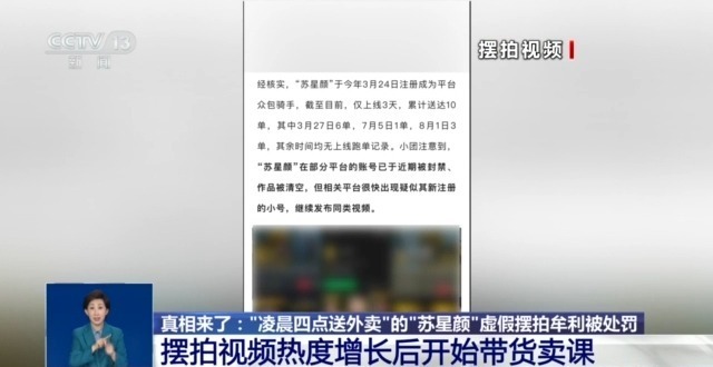 外卖平台相关负责人 胡靖海:我们是今年6月初的时候关注到的,身穿美团的外卖骑手工作服,以骑手的身份出镜,去谈自己跑外卖的悲惨经历,其中不少视频的浏览量都是超过10万+的。经过核实“苏星颜”也就是杨某,在3月注册以来只跑了10单,他没有实际从事骑手配送,而是通过骑手这样一个身份给自己的账号进行引流增量。我们也还发现“苏星颜”相关内容,包括IP,有高度一致性的其他账号。