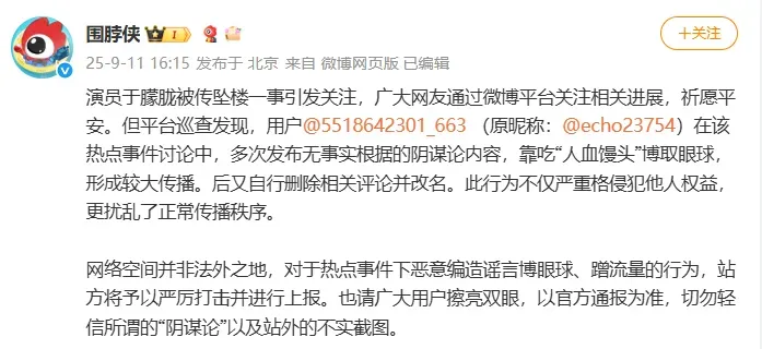 11日下午@围脖侠 发文:演员于朦胧被传坠楼一事引发关注,广大网友通过微博平台关注相关进展,祈愿平安。但平台巡查发现,用户@5518642301_663 (原昵称:@echo23754)在该热点事件讨论中,多次发布无事实根据的阴谋论内容,靠吃“人血馒头”博取眼球,形成较大传播。后又自行删除相关评论并改名。此行为不仅严重侵犯他人权益,更扰乱了正常传播秩序。