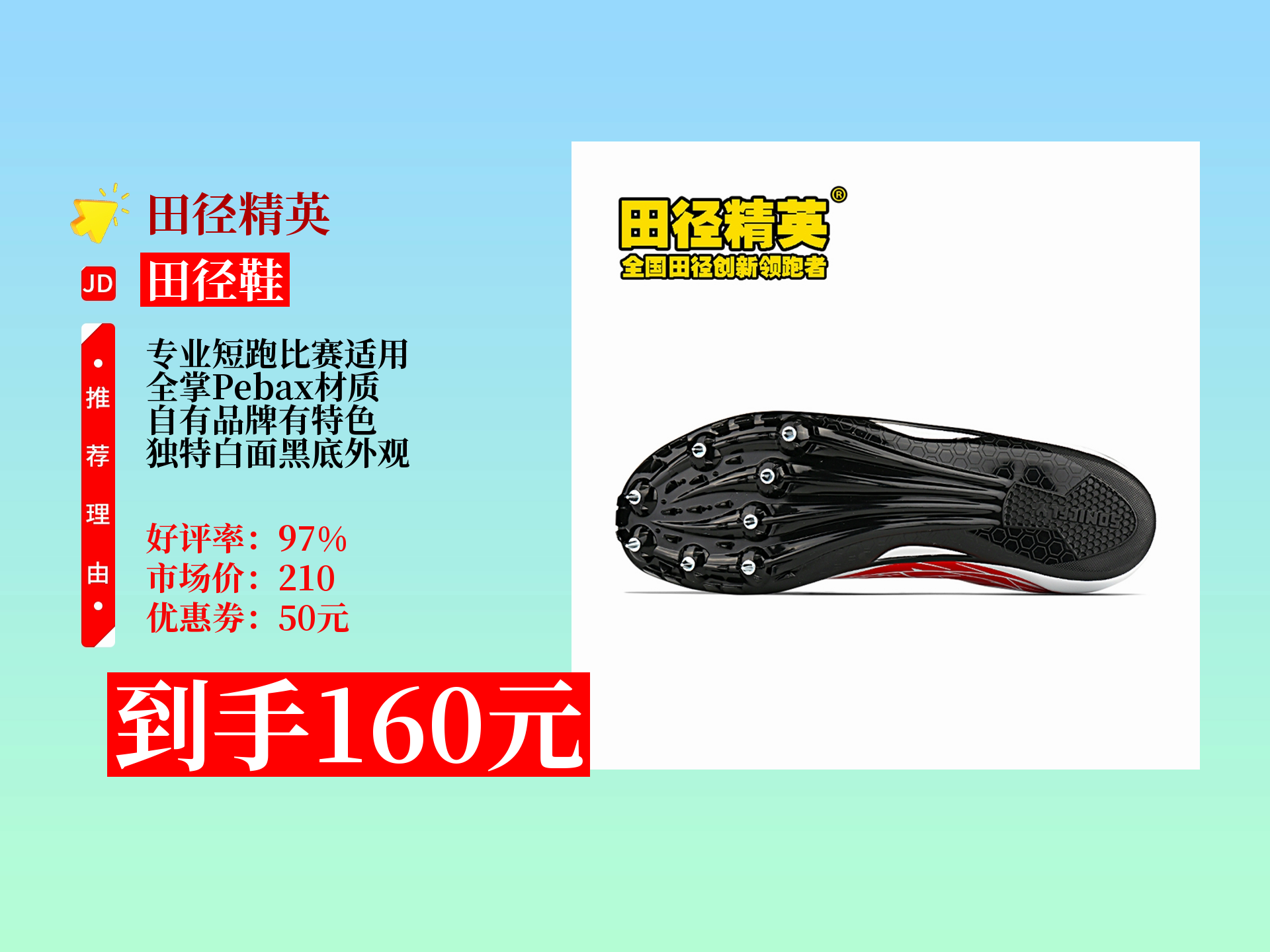 2025年田径鞋怎么选?专为热爱短跑的运动达人们推荐!大家在寻找专业短跑钉鞋时,是不是常苦恼价格高、性能不足?宙斯专业短跑钉鞋来啦!全掌Pebax,提供出色的支撑与动力反馈。相比其他钉鞋,它价格超亲民,原价210,领券160就能拿下。虽然39码偏小,但不影响其成为性价比之王。不管是专业赛事,还是日常训练,穿上它,助你在跑道上风驰电掣,赶紧冲!