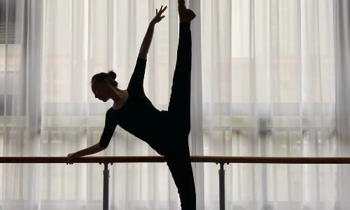 在探海舞姿上,由动力腿主动的再继续往上抬到180°,骨盆随着腿的高度继续向前倾到完全垂直的贴在主力腿上,形成—个直体前倾180°的垂直面。
