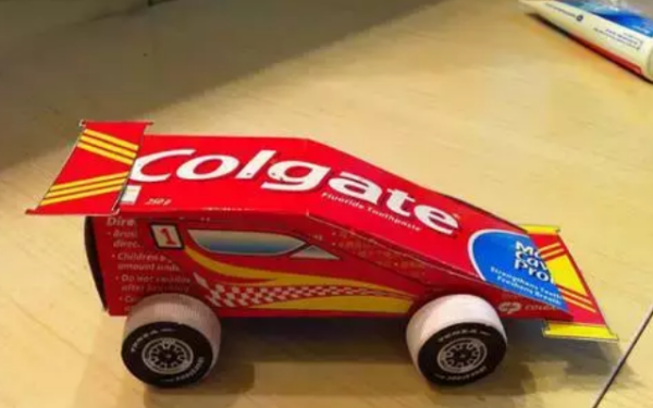 7,翻过来调整一下,如图所示,一个废旧物品做的小汽车就做好了。