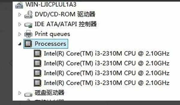 在“系统”的左边栏中找到“设备管理器”并点击进入,可以看到CPU、显卡、声卡、网卡等配置信息。如图,下面是我的电脑CPU信息(我的是Core i3 2310M,双核,四线程,所以显示是“4”个cpu)。