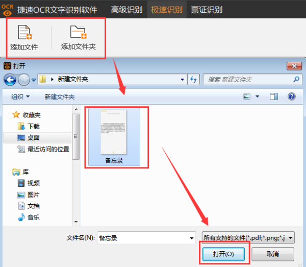 双击打开该软件,在页面中找到“添加文件”在弹出的窗口添加需要识别的文件并打开