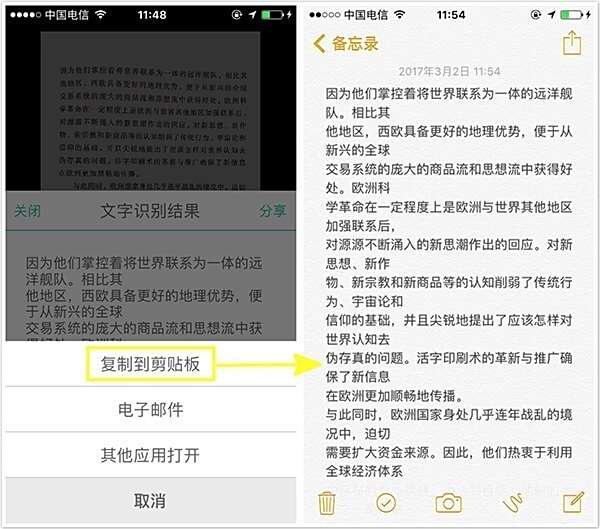 5、【分享】文字识别结果,选择【复制到剪切板】,就能将文字复制到手机备忘录或 Word 文档里啦!