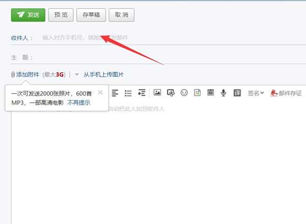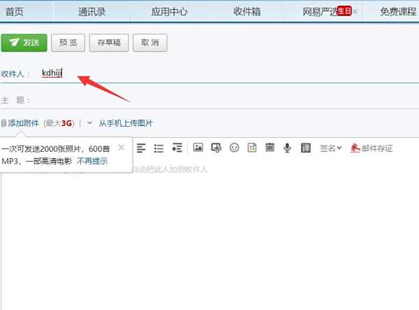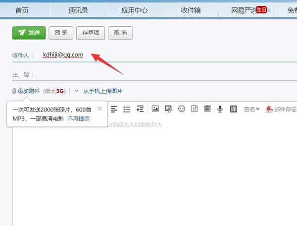 3、在收件人一栏输入正确的电子邮箱地址,地址输入错误就不能发送邮件。