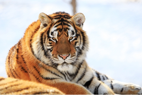虎是哺乳纲的大型猫科动物;毛色浅黄或棕黄色,满身黑色横纹;头圆、耳短,耳背面黑色,中央有一白斑甚显著;四肢健壮有力;尾粗长,具黑色环纹,尾端黑色。