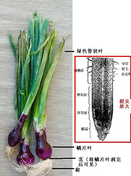 洋葱的绿色管状叶,为浓绿色圆筒形中空叶子,表面有蜡质。下面是鳞片叶,实际为肥厚的叶鞘,呈鳞片状,密集于短缩茎的周围,形成圆球形鳞茎,须根呈线状。如下左图所示。