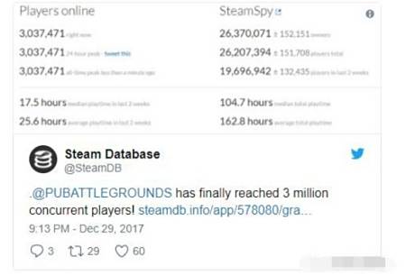 12月30日,根据SteamDatabase的信息,《绝地求生》的同时在线玩家数量已经突破300万人,在Steam上售出超过2500万份。而在移动端上与之类似的游戏例如《终结者》《荒野行动》等也在各大渠道榜单中久居不下。
