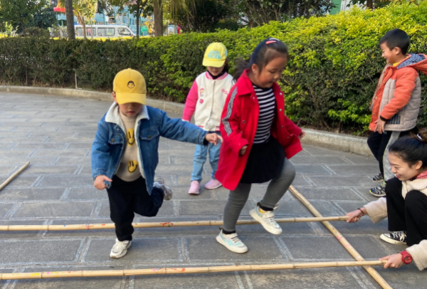 两人双手各握1根橡皮筋代替竹竿,双膝跪地,“持竿者”发出统一的口令,随着口令的节奏,不断使手中的“竹竿”一开一合,“跳竹竿”者随着竹竿的开合,灵巧、优美地跳跃其间。