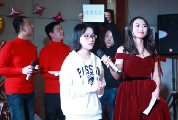 游戏道具是词卡,两人一组,两人相对而站,一个表演一个猜词,主持人拿词卡给表演者观看,表演者通过不说话只演动作的方式表达词卡的内容,让猜词者猜,在规定时间内看哪一组猜对的词语最多。多人一组,背对主持人排列站,第一个组员看完词卡之后表演给下一位,下一位再表演给后一位,依次传递,最后一位说出答案,看哪一组答对的时间最短。