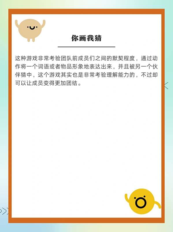这种游戏非常考验团队前成员们之间的默契程度,通过动作将-一个词语或者物品形象地表达出来,并且被另一个伙伴猜中,这个游戏其实也是非常考验理解能力的,不过却可以让成员变得更加团结。