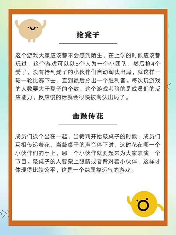 这个游戏大家应该都不会感到陌生,在.上学的时候应该都玩过,这个游戏可以以5个人为一个小团队,然后抢4个凳子,没有抢到凳子的小伙伴们自动淘汰出局,就这样一轮一轮比赛下去,直到最后分出一个胜利者。每次玩游戏的人数要大于凳子的个数,这个游戏考验的是成员们的反应能力,反应慢的话就会很快被淘汰出局了。