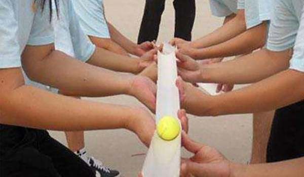 规则:报纸折成水槽状,用手握好,全队人纵向并排站,第一人把乒乓球从报纸槽中滚过去后,迅速调整位置至最后一人下方,第二人同样操作,以此类推将乒乓球运送至终点线。中途乒乓球跌落允许用手捡起从跌落位置继续。
