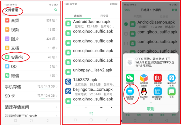 要想把手机上面的软件传到电脑上,你可以在手机和电脑安装91手机助手,或用USB口把手机与电脑通过wifi或USB口的连接线,把手机上预先下载的软件发送到手机即可。可以进入桌面的“文件管理”→“安装包”→勾选你预先下载的软件,点击“发送到电脑”即可。(注意:手机软件在电脑是不能直接使用,需要安装虚拟手机软件后才能使用。或者在电脑上直接下载手机软件的电脑版,是可以在电脑上面使用的。)随着软件的增加,方法越来越多,你也可以安装云盘,把手机上面的软件或文档放到云盘,再从电脑上面登陆到云盘,从云盘下载到电脑,还可以在电脑安装微信的电脑版,在手机上面操作,把手机中的东西粘贴到微信,再在电脑打开微信的电脑版,由于手机与电脑是捆绑在一起的,是同步传送信号的,内容是相同的。现在有了无线投屏、USB有线投屏,又可以在电脑安装投屏软件或使用无线投屏硬件,均可以通过有线与无线的方式把手机与电脑连接起来,又多了一种相互控制、交流的手段:新技术不断涌现,需要你去摸索、实操、积累经验,探讨多种方法,总会有你喜欢的方法:
