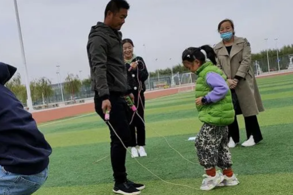 游戏规则:每个班派5名家长和5名幼儿参加,每个家庭一组,家长用绳子,幼儿站在中间,听到口令后一起跳,谁在规定时间内跳的数量最多就是获胜者。
