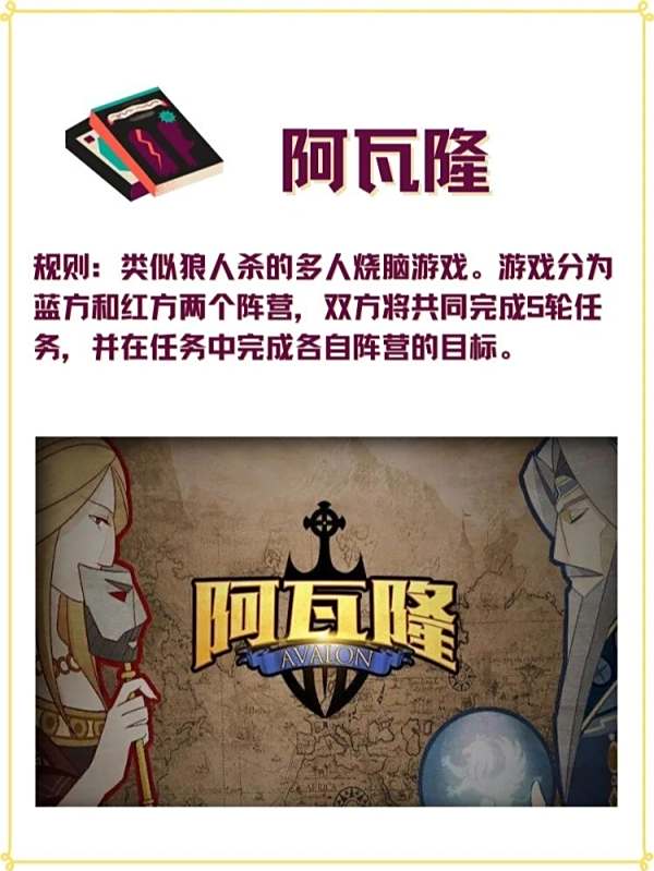规则:类似狼人杀的多人烧脑游戏。游戏分为蓝方和红方两个阵营,双方将共同完成5轮任务,并在任务中完成各自阵营的目标。