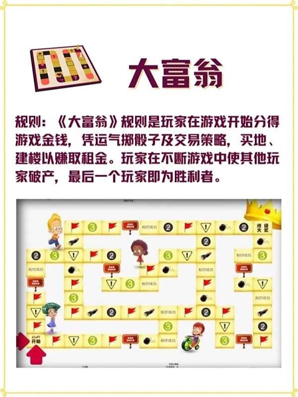 规则:《大富翁》规则是玩家在游戏开始分得游戏金钱,凭运气掷骰子及交易策略,买地、建楼以赚取租金。玩家在不断游戏中使其他玩家破产,最后一个玩家即为胜利者。这类聚会宝藏桌游,具体玩法,蜂仔有时间细说,可以先码一步~