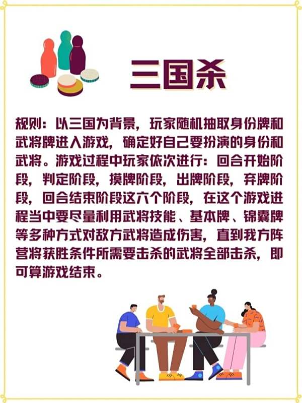 规则:以三国为背景,玩家随机抽取身份牌和武将牌进入游戏,确定好自己要扮演的身份和武将。游戏过程中玩家依次进行:回合开始阶段,判定阶段,摸牌阶段,出牌阶段,弃牌阶段,回合结束阶段这六个阶段,在这个游戏进程当中要尽量利用武将技能、基本牌、锦囊牌等多种方式对敌方武将造成伤害,直到我方阵营将获胜条件所需要击杀的武将全部击杀,即可算游戏结束。