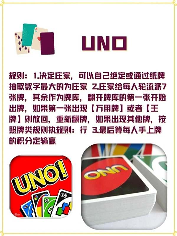 规则:1.决定庄家,可以自己绝定或通过纸牌抽取数字最大的为庄家 2.庄家给每人轮流派7张牌,其余作为牌库,翻开牌库的第一张开始出牌,如果第一张出现【万用牌】或者【王牌】则放回,重新翻牌,如果出现其他牌,按照牌类规则执规则:行 3.最后算每人手上牌的积分定输赢